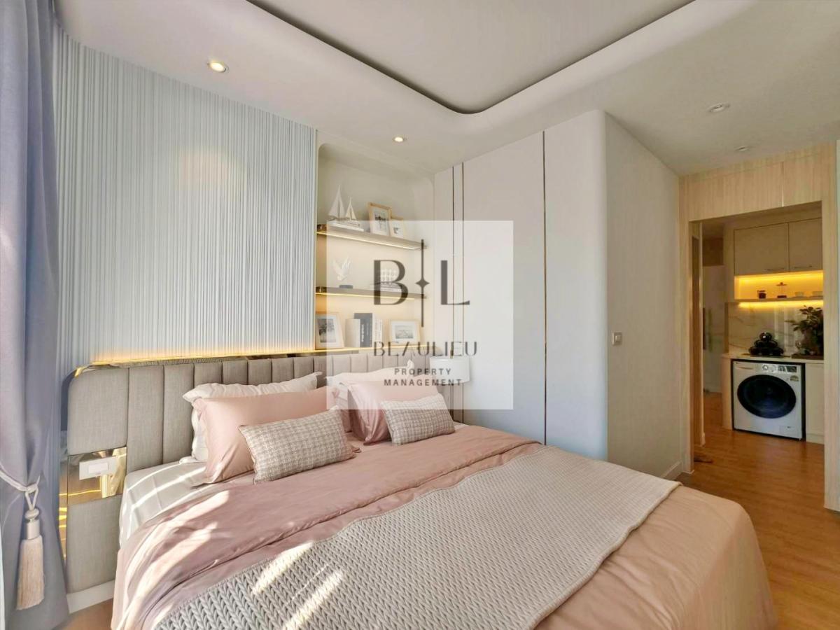 Large floor-to-ceiling windows and a spacious balcony invite natural light and fresh sea breeze, while showcasing stunning views of Jomtien Beach and the Gulf of Thailand. The modern kitchen is fully equipped with premium finishes, ideal for everyday living and entertaining.