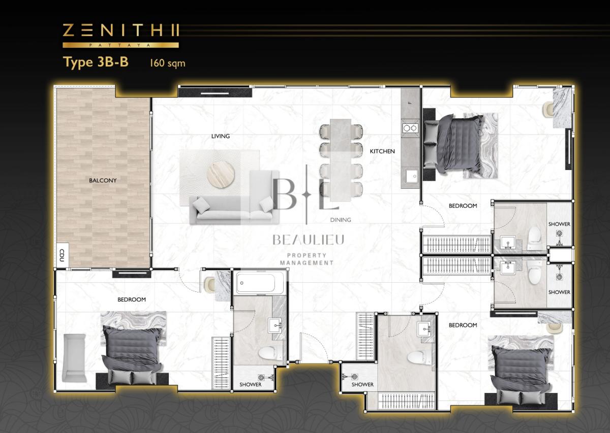 Discover Zenith Pattaya, a brand-new luxury condominium project offering modern living in the heart of Pattaya. This exclusive 3-bedroom, 3-bathroom unit spans 160 sqm and boasts a stunning pool view, perfect for those seeking a stylish and comfortable retreat.